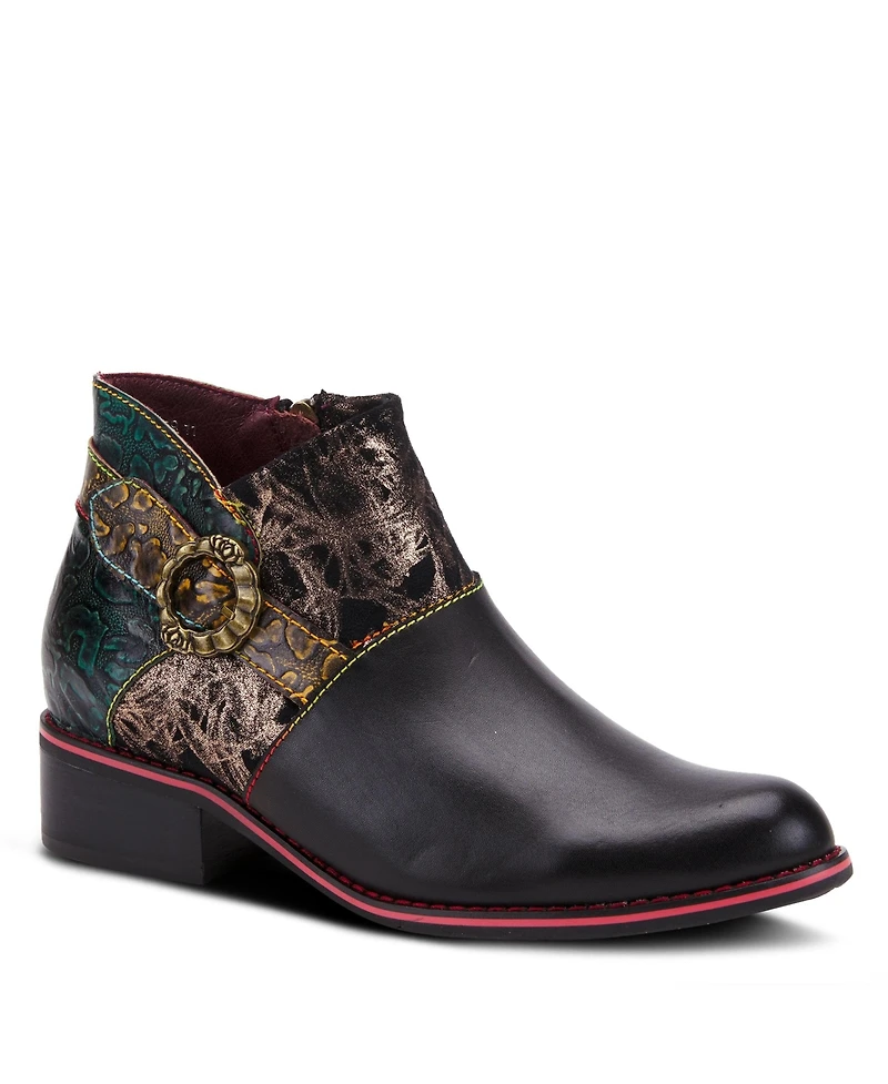 Step into effortless artistry with the L'Artiste Tiatia - a mixed-material ankle bootie designed with French flair. This unique silhouette blends hand-painted embossed leather, brushed smooth leather, and soft micro suede for rich visual texture. An asymmetrical decorative strap with vintage-style buckle adds character, while a flat block heel and flexible rubber sole provide everyday wearability. Lined with soft printed velvet and finished with a cushioned insole, Tiatia brings color, comfort, and creativity to any fall wardrobe. Shaft height: 4"". Circumference: 9½"". Heel height: 1"". Fits true to size.