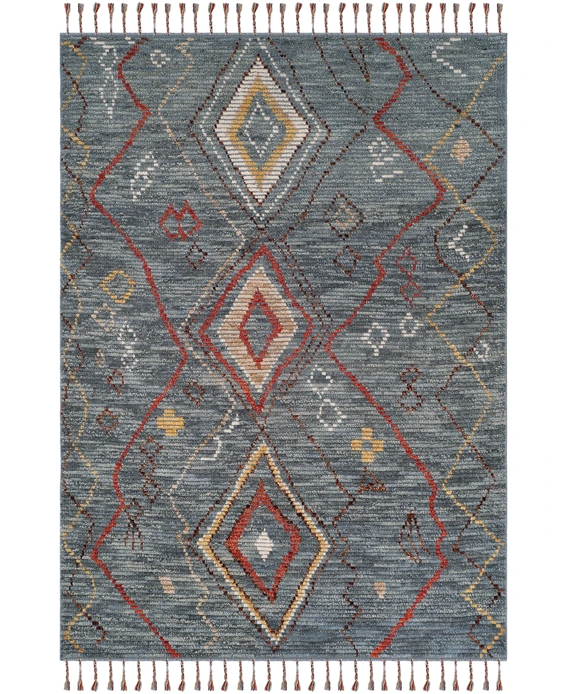 Rooted in nomadic tradition, transforming sublime tribal art motifs into boho-modern decor. Masterfully restyles nesting diamonds and lined patterns in remarkable hues against a denim backdrop. A linear, rippled texture accentuates Nahla's bohemian charm. Hand-knotted using pure mountain wool. Nahla's meld of colors are joined in long braided fringes.