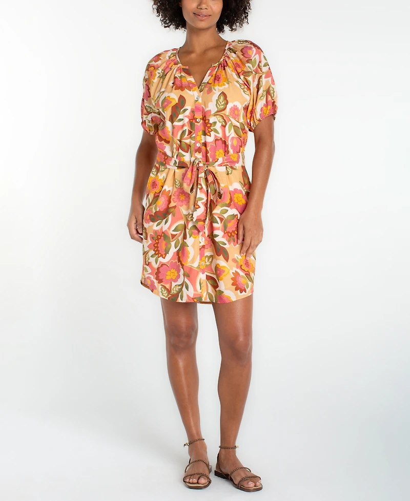 Refresh warm-weather dressing with this Liverpool Los Angeles short-sleeve dress, where a lively floral pattern and modified V-neck create a soft, feminine look. Removable self-tie waist allows adjustable styling, while elasticized sleeve ensure comfort and the button-front design with side seam pockets adds everyday function.