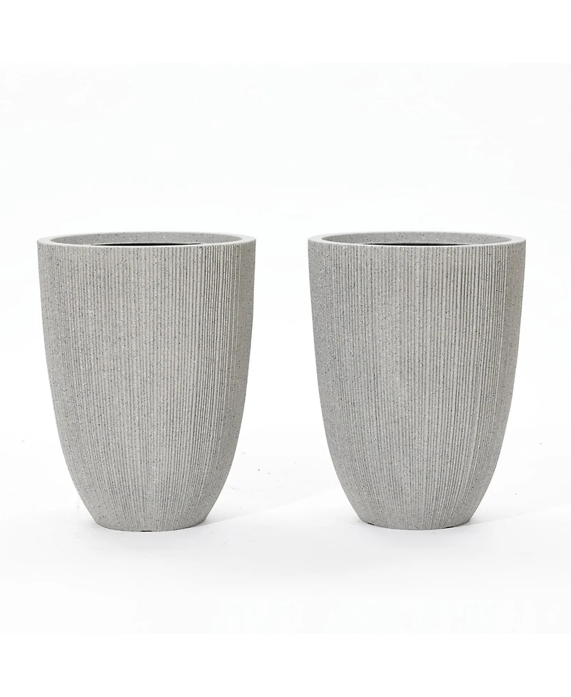 Introducing the set of two planters that will elevate your home decor to the next level! With a sleek and elegant look, these planters are perfect as patio accents or when placed along a wall. Designed with a tall tapered round shape and featuring a unique striped pattern on their concrete-textured surface, they are sure to attract compliments from all who see them. Made from polyethylene, these planters are Uv and weather-resistant, virtually unbreakable, and can withstand outdoor conditions without cracking or chipping. Each planter is equipped with a drainage hole to allow your plants to flourish and thrive. This spacious set of two striped planters caters to all your gardening needs. Don't miss out on the chance to add these stunning planters to your indoor or outdoor space!
