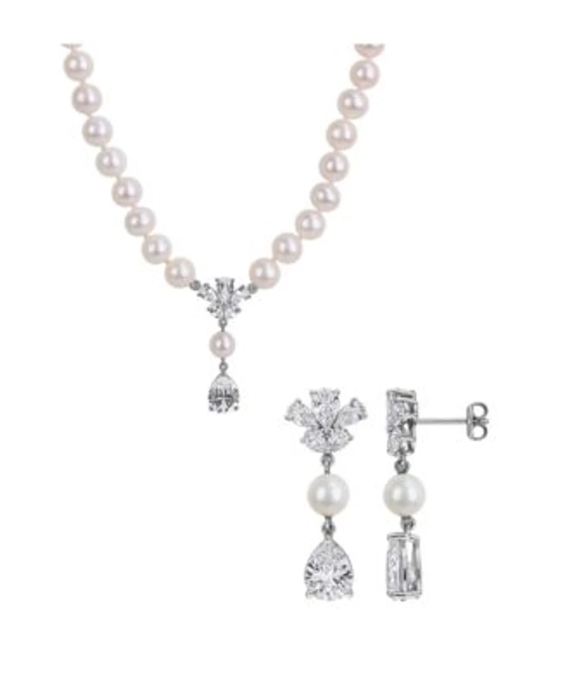 Macys Cultured Freshwater Pearl Created White Sapphire Drop Earrings Necklace In Sterling Silver Collection