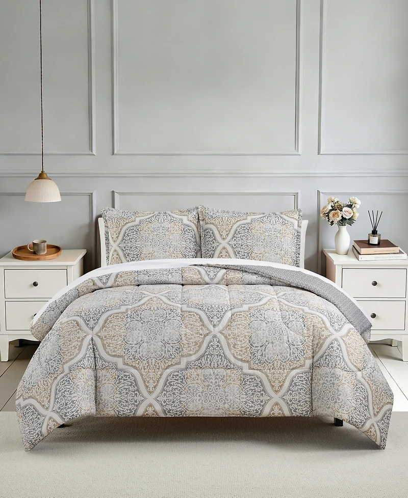 The Estelle Comforter Set by Macy's offers refined medallion artistry in soft neutral tones. Printed reversible for added versatility, its harmonious pattern and gentle palette create an effortlessly elegant look that brings balance and serenity to a beautifully styled room.