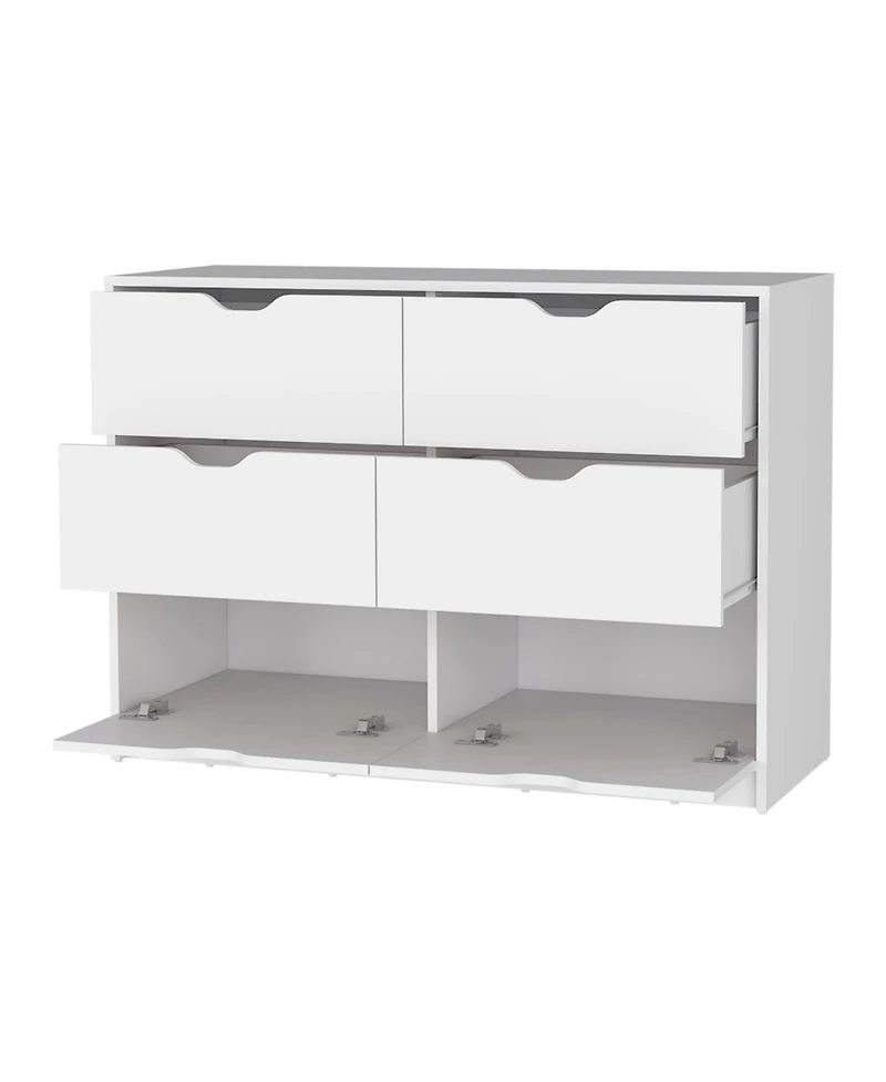 This White/Black Manufactured Wood Six Drawer Modern Dresser is a practical and good looking accent for your bedroom. Make your room functional and visually enticing with this masterful dresser that includes a mix of pull out drawers and two bottom drawers that open with a pull-down door. Its a high quality piece, made from high grade manufactured wood. The white coloration of this piece is neutral and will blend easily with most any decor.