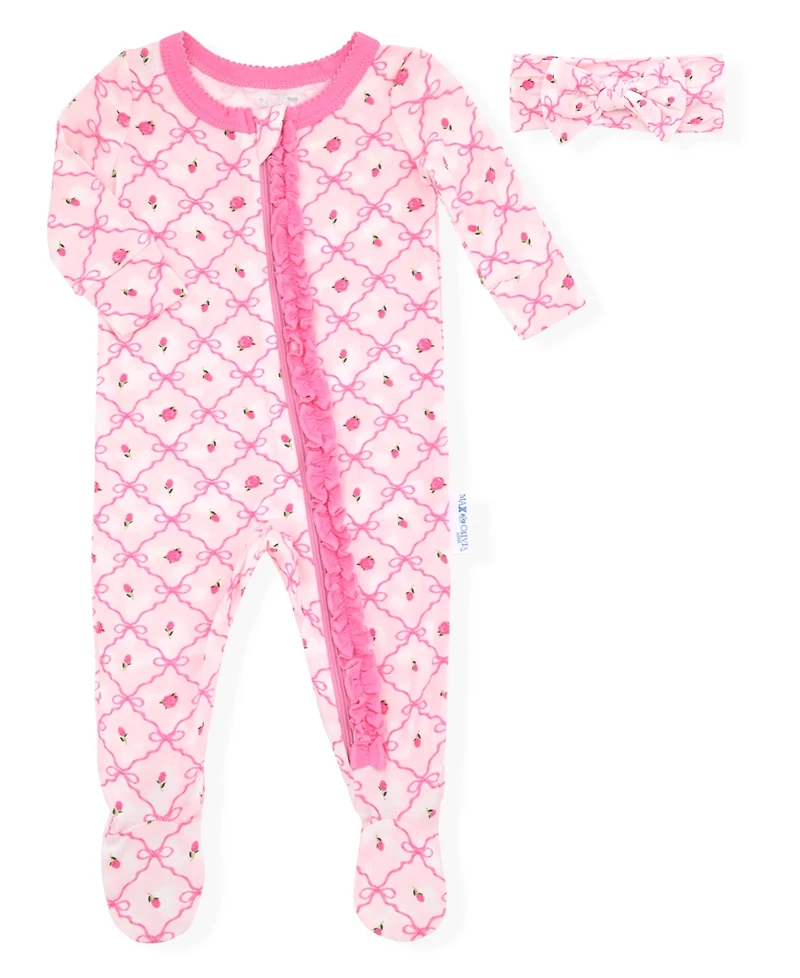 Add a charming touch to your baby's wardrobe with this onesie set by Max & Olivia, showcasing a delicate bow-inspired print with a ruffle detail along the front. The enclosed foot design offers full coverage, while the matching headband brings the look together with a soft, comfortable hold.