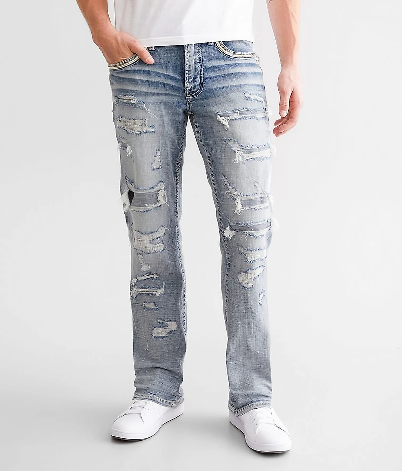 Regular fit jean Performance stretch fabric for a higher level of flexibility Straight from knee to hem Low rise, 16 1/2" bottom opening Color pop stitch embroidered faux button flap back pockets Hand sanding, whiskering, grinding, destruction with fill yarn, denim backing and repair stitch details Zip fly