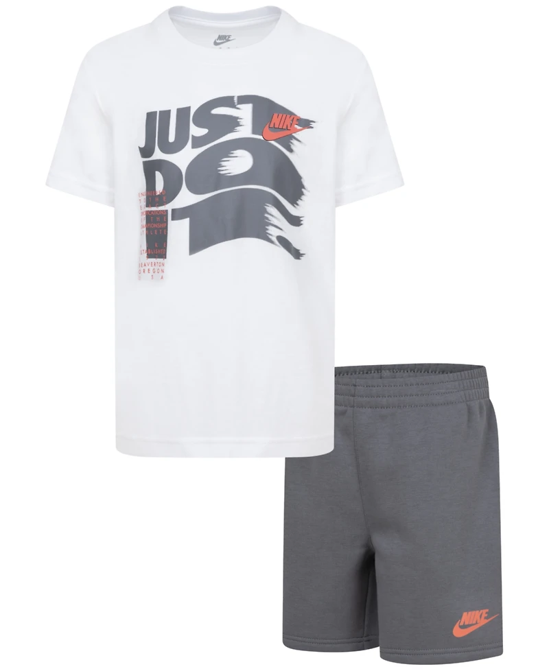 A fun look you'll both feel good about, this set from Nike features a Just Do It graphic on the move. The jersey T-shirt pairs perfectly with soft French terry shorts.