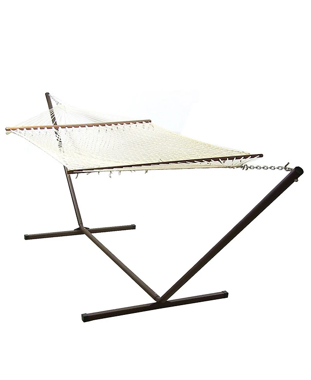 Cotton Double Wide 2-Person Rope Hammock with Spreader Bars and Curved Arc Wood Stand - 400 lb Weight Capacity /13' Stand