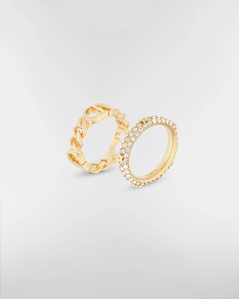 The set of modern Petit CD rings is distinguished by an asymmetric and streamlined design. One of the rings is characterized by gold-finish metal links accented by CD signatures, while the other features a pavé of white crystals and is adorned with hallmark stars. The modern and elegant ring set may be coordinated with other creations from the Petit CD line.