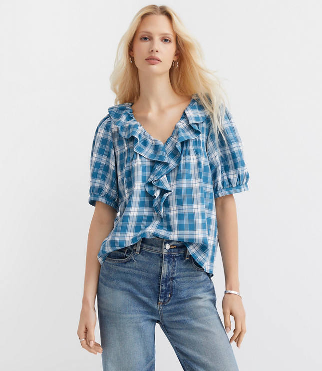 Pintucked in front and back for an extra tailored twist, this blouse effortlessly ruffles up your everyday style. V - neck. Short sleeves with button cuffs., Bullet1: 24"long, Imported:, Fit: Relaxed an easy shape that's just shy of loose, Length: Regular - hits below natural waist, Fabrication: 60% Polyester 40 Rayon, Garment Care: Machine Washable Loft Plaid Pintucked Ruffle Blouse Size Large Pacific Sea Women's by Loft Size Regular - L Pacific Sea Women's Polyester / Poly, Blend V - Neck, Short Sleeve Blouse Tops Wear to Work 60% Polyester 40% Rayon Machine Washable