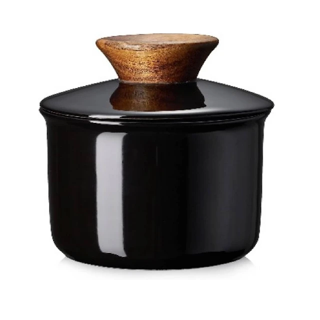 Porcelain Butter Keeper Crock, French Butter Dish with Lid to Leave on Counter - Black Wood