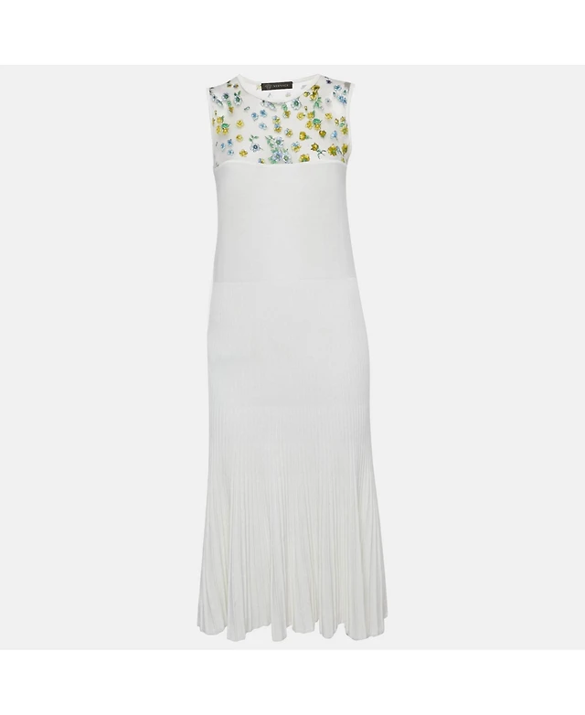 Pre-Owned Versace Women's White Floral Print Mesh And Knit Flared Midi Dress