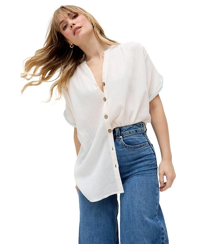 Raffya Women's Juneeta Crop Sleeve Button Down Shirt