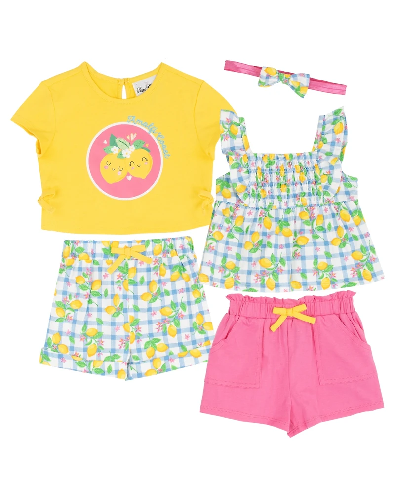 Stock up her sunny-day wardrobe with this adorable 4-piece lemon applique & print short set, featuring a soft butter-yellow T-shirt with a sweet ""Amalfi Coast"" lemon graphic and side-tie hems, a breezy blue gingham short with allover lemon-and-floral print and a bow-tied waist, a matching gingham smocked flutter-sleeve top that flares into a peplum with ruffle straps, and a playful bubblegum-pink paperbag short with roomy patch pockets and a dainty bow, all topped off with a coordinating flower hair claw for an extra pop of cute.