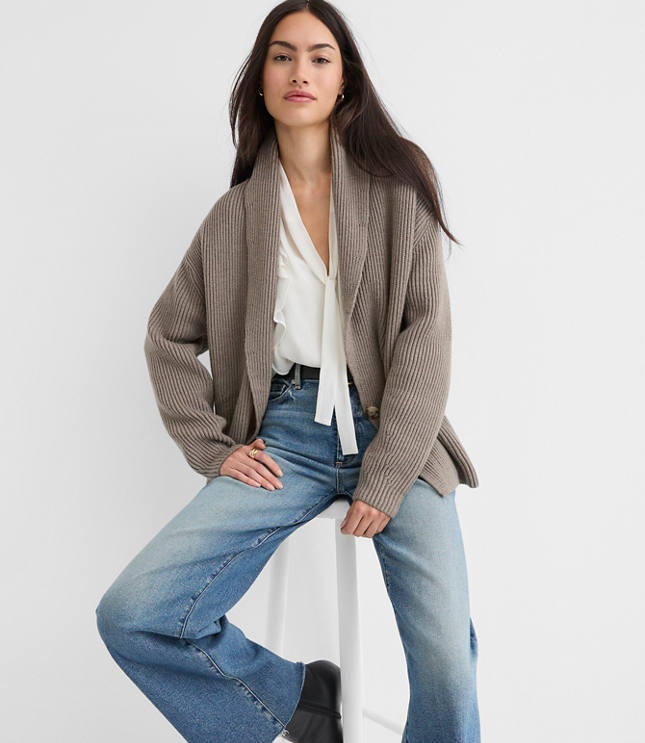 Styled with a double breasted button front, shawl collar and the perfect slouch, we love the tailored meets relaxed appeal of this cotton blend knit. Long sleeves, Bullet1: Sweater weight Midweight, Hit: Hits at hip, Imported:, Fit: Relaxed an easy shape that's just shy of loose, Length: 25 1/2"long, Fabrication: 52% Cotton 48 Polyester, Garment Care: Machine Washable Loft Ribbed Double Breasted Cardigan Sweater Size Large Cedar Melange Women's by Loft Size Regular - L Cedar Melange Women's Cotton, Blend V - Neck, Long Sleeve Cardigan Sweaters Other 52% Cotton 48% Polyester Machine Washable Best Fall Sweaters