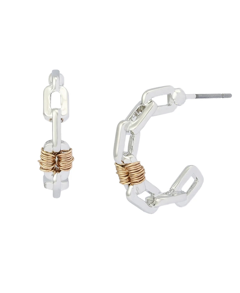 Sophisticated small-sized hoop earrings featuring an open silhouette with refined paper clip chain links. Adorned with contrasting wire wrapped details perfect for an every day statement.