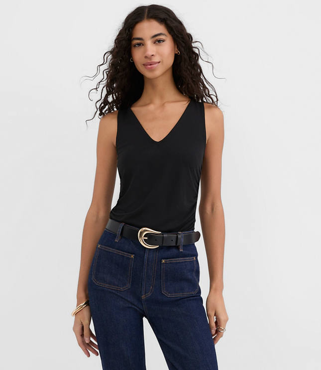 It's soft and comfy, it's modern and chic, it's pulled - together and flattering - this ruched stretch matte jersey top is an everyday game - changer. V - neck. Sleeveless, Hit: Hits at waist, Imported:, Length: 22 1/2"long, Fabrication: 95% Polyester 5 Spandex, Garment Care: Machine Washable Loft Ruched V - Neck Top Size 2XS Black Women's by Loft Size Regular - 2XS Black Women's V - Neck, Sleeveless Shirts Tops Wear To Work 95% Polyester 5% Spandex Machine Washable