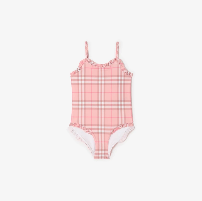 A swimsuit in stretch nylon, printed with the Burberry Check in seasonal peony pink. The style is framed with ruffled trims.