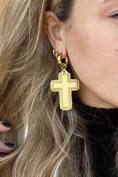 - These chunky 22k gold vacuum plated stainless steel hoops are fitted with removable, handcrafted 12k antiqued gold plated steel Italian cross charms. These earrings are on the heavier side, definitely not an everyday pair but a yes, yes, yes for that party or special dinner!