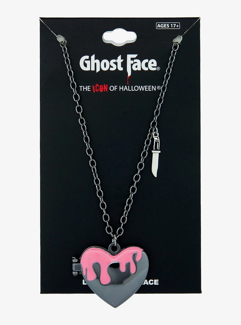 Ring, ring! It's Ghost Face on the line for ya! Rep your love for Scream with this necklace! Featuring a knife charm and a heart locket with pink drip detailing. Open it up to reveal Ghost Face and "Call me?" verbiage.