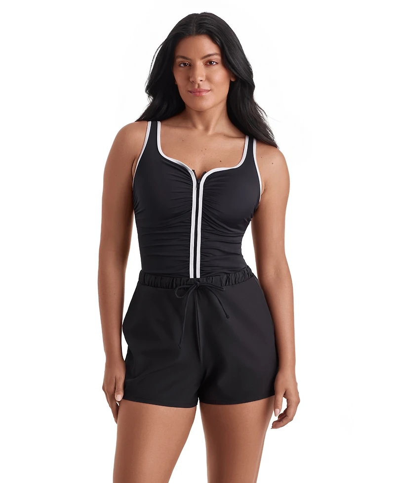 Combining boy short bottoms with a locking front zipper, this ShapeSolver swimsuit features pockets. An adjustable drawstring enhances fit and comfort, ensuring ease of movement.