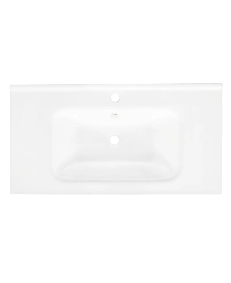 Elevate your bathroom with this elegantly designed 35.6" ceramic sink, crafted to bring sophistication and function to any modern vanity. The rectangular silhouette delivers a generous washing space, while the integrated overflow feature ensures peace of mind by preventing accidental spills. Engineered from high-grade ceramic, this basin offers lasting durability and maintains a flawless, glossy finish through daily use. The vessel-style installation allows for versatile placement on most vanity countertops, making it ideal for new bathrooms and remodels alike. The non-porous surface resists stains and scratches, making cleaning effortless—a simple wipe restores its shine. Designed for straightforward installation, this basin comes with all necessary mounting accessories, ensuring a seamless fit and a hassle-free setup. Redefine your daily bathroom experience with timeless style, practical features, and reliable quality. Dimensions: 35.6"W × 18.7"D × 7.4"H.