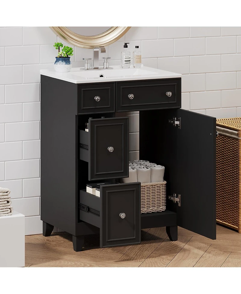 Maximize both style and storage in your bathroom with this thoughtfully designed 24-inch vanity cabinet. Its compact footprint is ideal for smaller spaces, while still offering ample room to keep your essentials organized and easily accessible. Two smooth-gliding drawers and a spacious cabinet door provide versatile storage options for towels, toiletries, and daily necessities. The included ceramic sink features a sleek, easy-to-clean surface that resists stains, ensuring a fresh look day after day. Constructed with a durable blend of solid wood feet and Mdf, this vanity is built for lasting strength and stability. Elegant golden handles add a refined touch, elevating the appearance of any modern or transitional bathroom. Assembly is straightforward with clear instructions, and all necessary hardware is included for a hassle-free setup. Transform your bathroom with a perfect combination of function, durability, and timeless design. Dimensions: 24""W x 18.3""D x 34.3""H.