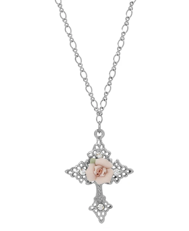 Silver-Tone Crystal Porcelain Rose Cross Pendant Necklace