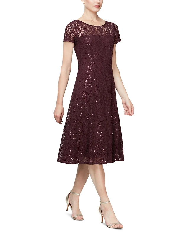 Sl Fashions Petite Sequined Lace Cap-Sleeve Dress