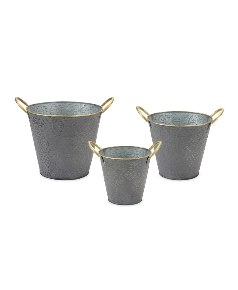 Beautifully distressed grey tones with gold accents in a geometric Aztec design, these durable metal planters will bring a luxurious touch to your home and garden. Show off your plants in style and enjoy to ambiance of nature inside your home. Complete the look by adding faux potted foliage, succulent, or floral plant to each planter.