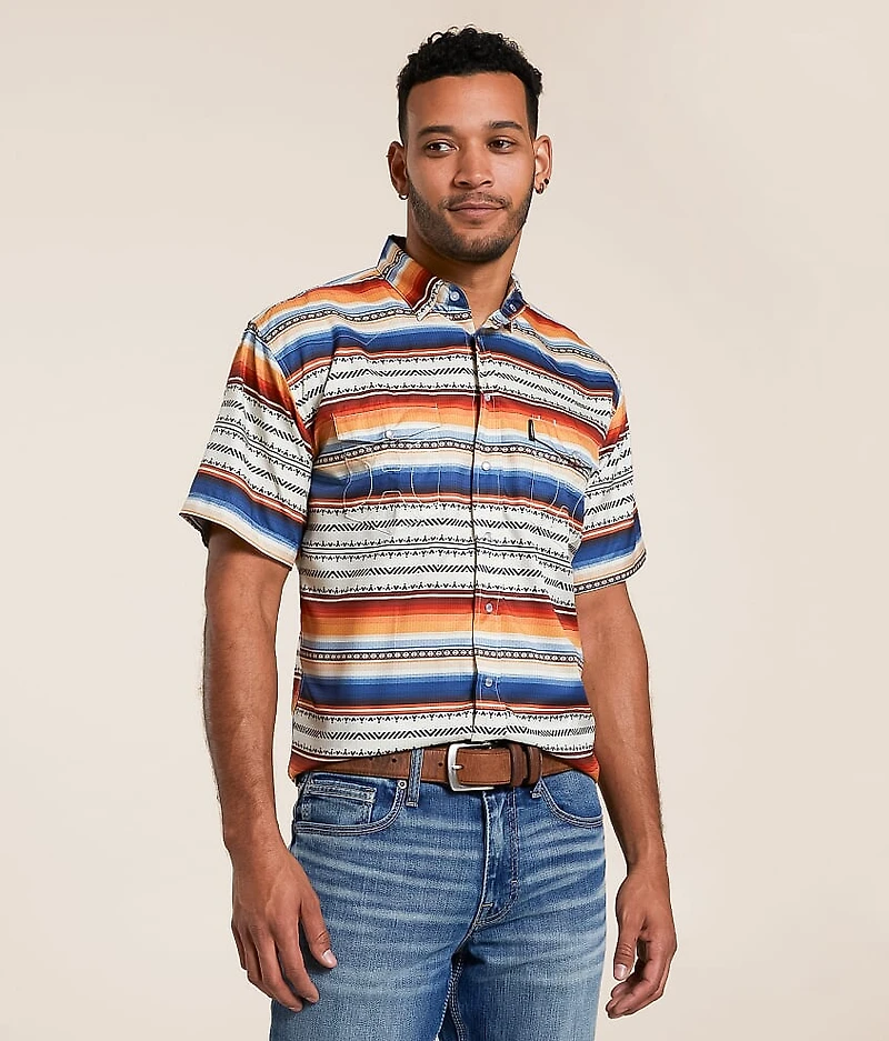 Habitat Collection Printed pearl snap front shirt Interior back mesh panel Microfiber lens cloth Hidden snap collar closure UPF 40 sun protection Moisture wicking fabric