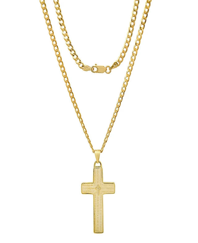 Steeltime Unisex 14K Gold Plated Sterling Silver Cuban Super Flat Chain and Lord's Prayer Cross Pendant Bracelet