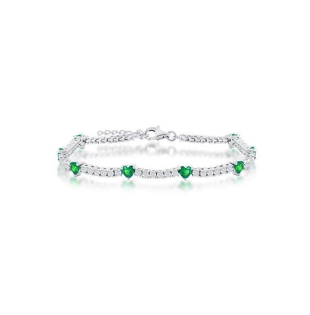 Sterling Silver Cz heart Tennis Bracelet (Green, Blue, Or Red)
