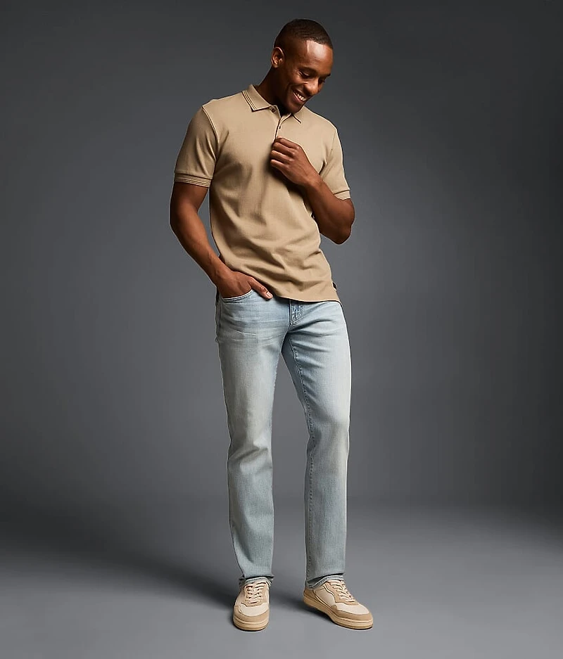 Slim fit jean Performance stretch fabric for a higher level of flexibility Mid-rise, 16" bottom opening Zip fly
