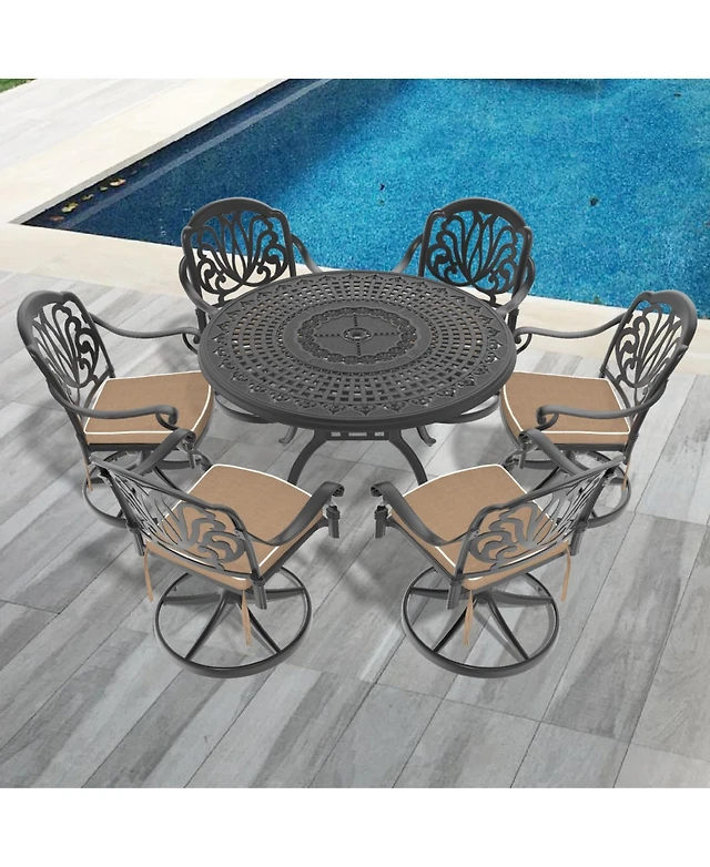Streamdale 7-Pc Cast Aluminum Dining Set, 6 Swivel Chairs, 47" Round Table, Black Frame