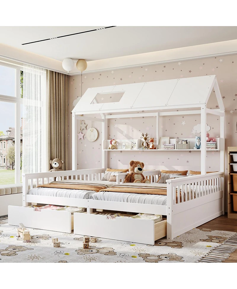 House-style double twin platform bed in white wood. Features storage shelves and drawers. Solid wood, no box spring needed. Fun and functional!