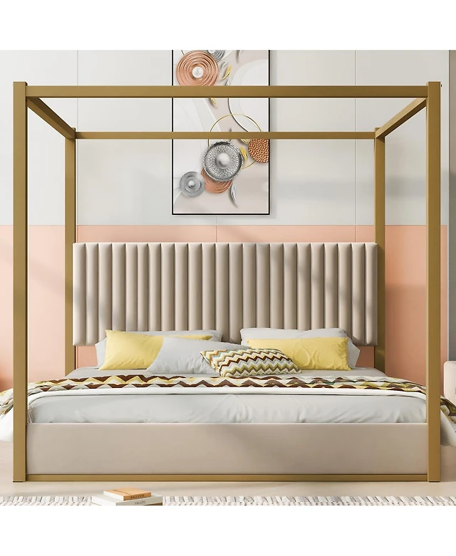 Streamdale King Size Beige Upholstery Canopy Platform Bed with Headboard & Metal Frame