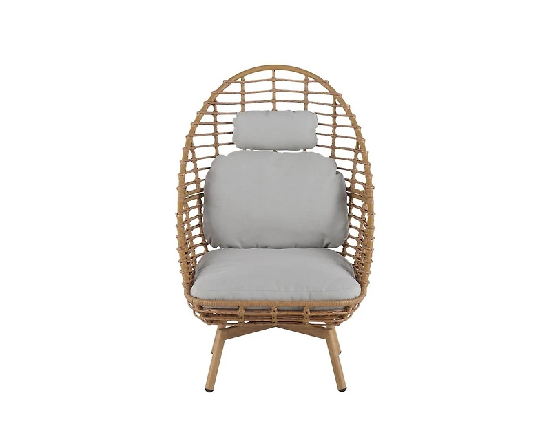 This outdoor swivel lounge chair combines towering comfort and earthy elegance for your patio, garden, or backyard. It features a high-back breathable light-brown rattan design with a sturdy swivel iron frame, supporting you comfortably while sunbathing, reading or stargazing. The smooth 360° swivel mechanism lets you pivot freely to follow sunlight or chat easily. Plush water-resistant beige cushions deliver layered luxury, while teak-finish legs and all-weather, Uv-stabilized, rust-resistant materials ensure lasting beauty and durability. Includes one lounge chair assembly required.