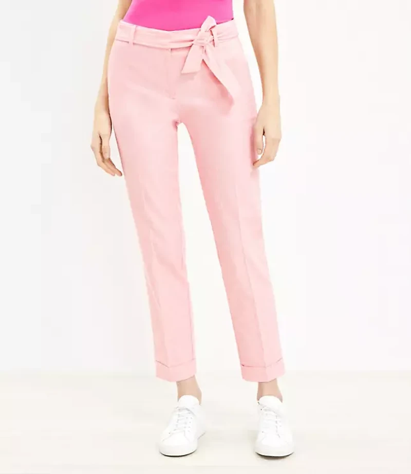 Pants Details: Front zip with hook and bar closure. Belt loops Removable waist tie. Slash pockets Back welt pockets., Leg Shape: Devin Slim - fitted through hip and thigh, with a cuffed tapered slim leg, Rise: Sits at natural waist, 10 3/8"rise, Imported:, Fit: Polished and modern, with elevated and versatile everyday style, Length: Ankle length, 30"inseam, Fabrication: 70% Cotton, 28% Linen, 2% Spandex, Garment Care: Machine Washable Loft Tall Devin Tie Waist Slim Pants in Twill Size 4 Paradise Peach Women's by Loft Size Regular - 4 Paradise Peach Women's Marisa, Slim Pants 70% Cotton 28% Linen 2% Spandex Machine Washable