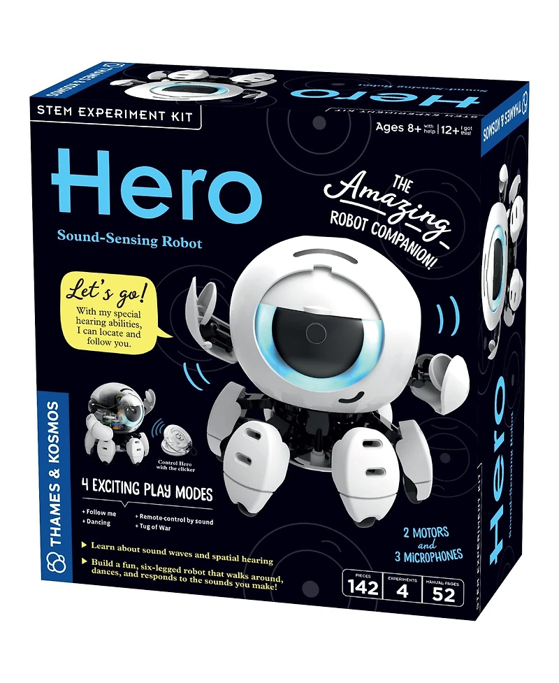 Make some noise, Hero hears everything Build a unique sound-sensing robot from over 100 parts and learn about engineering and sound technology as you play and experiment with your six-legged robot friend. Thanks to its three directional microphones, Hero perceives and reacts to sounds, allowing you to control it by clapping your hands, snapping your fingers, playing music, or using the included castanet. Hero's innovative design includes movable arms that disappear into its spherical body and a giant, illuminated eye for making facial expressions. The full-color, 52-page manual guides you through step-by-step assembly and includes a comic-book-style story about your new robot companion.