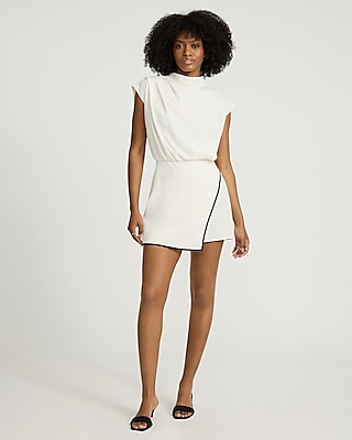 A chic romper that features a mock neckline, ruched bodice, and a tipped skort.