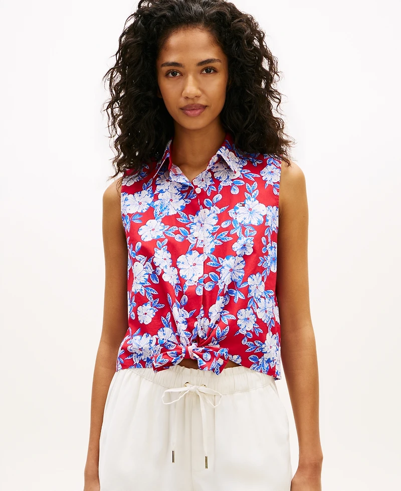 Tommy Hilfiger Women's Printed Poplin Knotted Collared Shirt