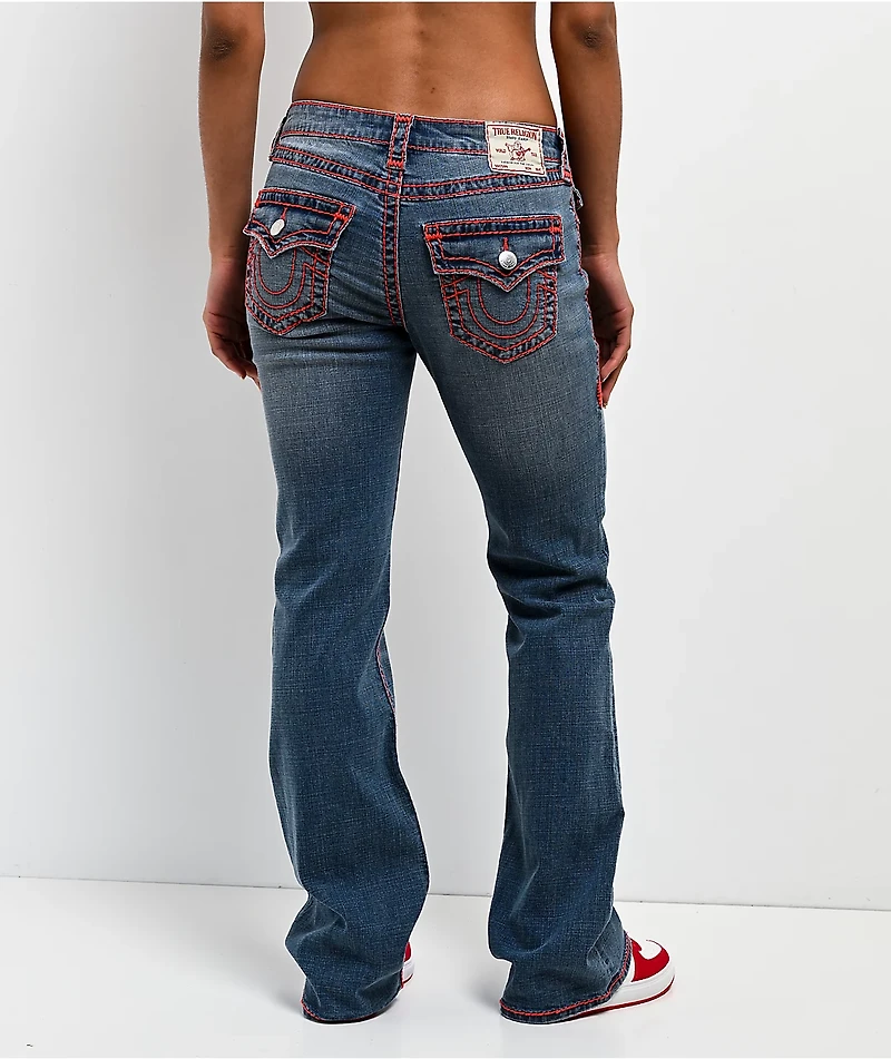 Built with True Religion’s signature Super T stitching, the Becca Laguna Tide mid rise bootcut jeans feature salmon-colored contrast thread across a washed blue denim base. The mid rise and bootcut silhouette give the jeans a slight flare through the