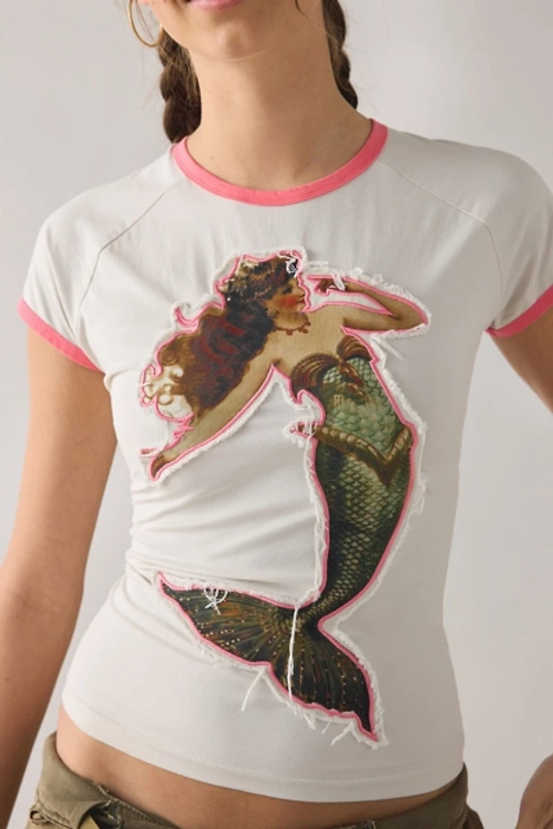 Whimsical Tyler McGillivary cotton tee made special with a raw-edge canvas mermaid applique graphic. Graphic tee featuring contrast ringer trim, crew neckline, short raglan sleeves and a cropped hem.
