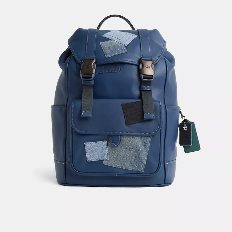 Pre-owned and now (re)loved, this League Flap Backpack is a very special Coach upcrafted design inspired by our commitment to rethinking and reducing our impact on the planet. Saved from the landfill, this gently-worn bag was lovingly repaired and transformed by our in-house craftspeople who added clever details to give it a second life. It’s completely one-of-a-kind, and comes with its own unique set of charms. Wear it, love it, pass it on.Reimagined with a casual-cool vibe by Rose Oliva featuring a dynamic denim patchwork in light-to-dark washes and hues, this sporty style has been expertly cleaned, conditioned and restored. Our talented craftsperson Fernando Gutierrez embellished the flap, front and pocket with a selection of Coach denim remnants, then added a playful repurposed charm. Made for a life in constant motion, the League is crafted of smooth leather and is a comfortable choice for every day with its padded back and straps. Organized with multiple pockets inside and out, it has a dedicated laptop sleeve and plenty of space for notebooks, water bottles and other essentials. An exterior zipper gives easy access to the main compartment.