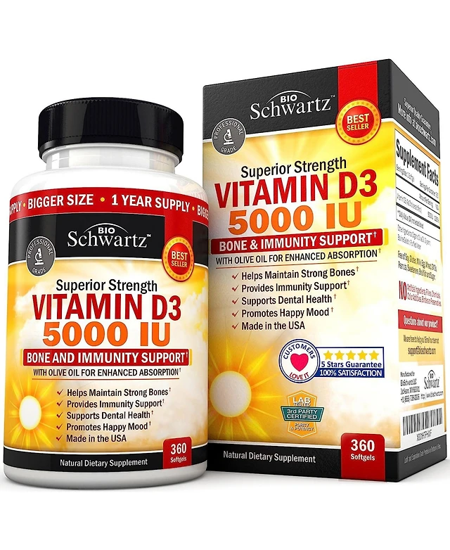 Vitamin D3 5000 Iu (125 mcg) Natural Immune Support Supplement, Bone Strength, Healthy Muscle Function, with Olive Oil for Highest Absorption, Gluten