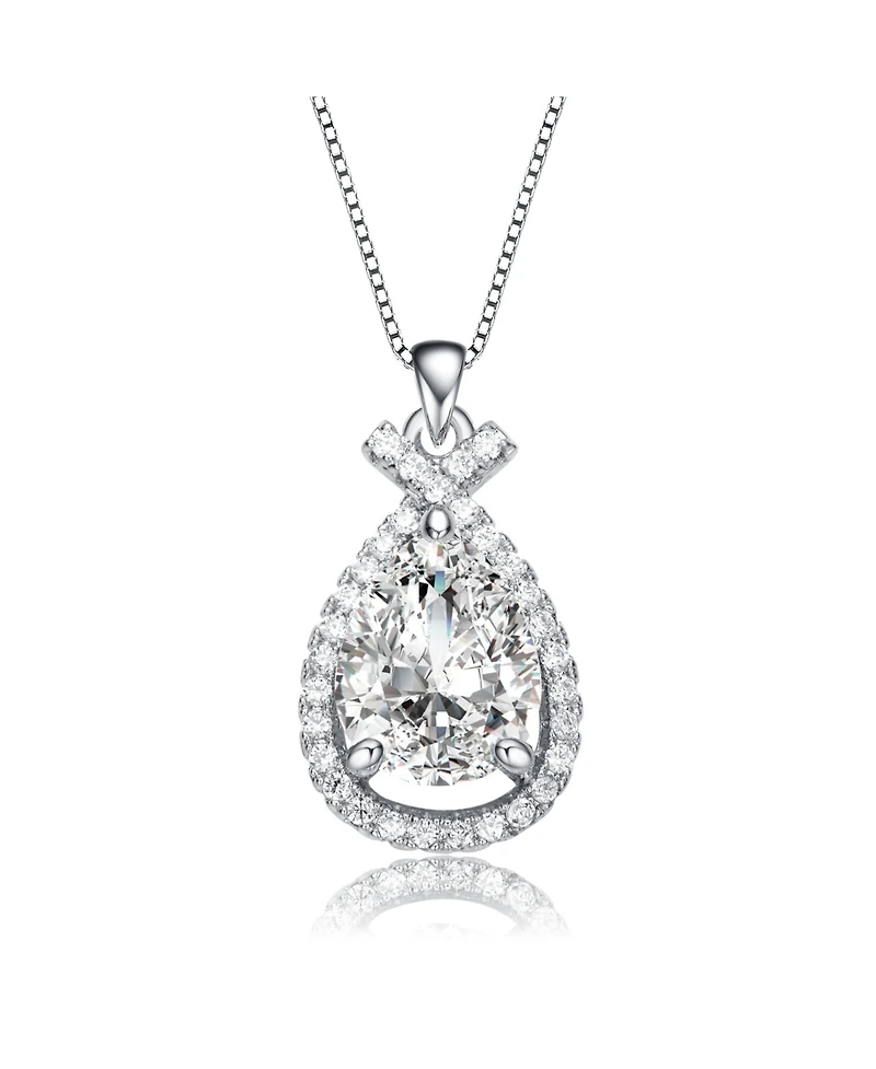 Capture the essence of pure radiance with this White Gold Plated Pear Rain Droplet Infinity Love Knot Pendant Necklace, a breathtaking fusion of modern luxury and timeless grace. This piece centers on a magnificent pear-shaped cubic zirconia solitaire, precision-cut for fire and brilliance. The Cz Centerpiece is cradled in a sophisticated three-prong setting, framed by a shimmering halo and crowned with an artfully interlaced infinity love knot that tapers into a polished bail. Whether catching the light at any special occasions or adding a touch of ""quiet luxury"" to your professional attire, this necklace offers an aspirational silhouette that feels as personal as it is powerful. Suspended from a silky-smooth box chain, it rests perfectly against the skin, serving as a constant reminder of elegance, strength, and eternal style. Contoured Rain Droplet Silhouette Exquisite Pear-Cut Solitaire Secure Three-Prong Setting Rachel Glauber Accessible Grandeur