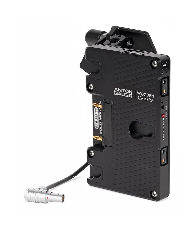 Become the ultimate power manager for your Red Komodo camera with the Battery Slide Pro Gold Mount. Designed for seamless integration, this essential accessory attaches effortlessly to the camera's left side, specifically into the Bp-9 battery slot, ensuring a secure and reliable power connection with a right-angle Lemo compatible connector. Crafted for versatility, the Battery Slide Pro features a user-friendly thumbscrew mechanism, allowing you to easily adjust the tilt and slide the plate to meet your shooting requirements without any tools. The robust plate is not just a power source but also a hub for your accessories, boasting three D-Tap outputs that deliver battery voltage directly to your essential gear. Stay informed and protected with the intelligent power monitoring system. The plate is engineered to keep a vigilant eye on the current, safeguarding against over-current situations. Should your accessories draw more than 5.