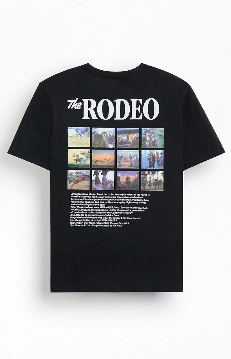 The Rodeo Pocket T-Shirt from Wrangler brings classic Western style to your everyday rotation. With short sleeves and a crew neckline, it features a single chest pocket with a Wrangler lasso graphic and a bold The Rodeo graphic on the back for a standout, rugged look.