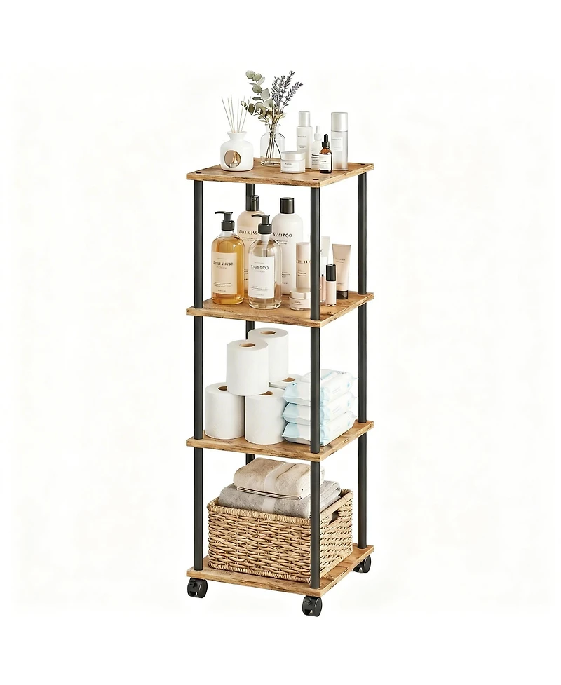 Easy mobility with four smooth wheels, two lock for steady placement. Four open shelves store towels, toiletries or kitchen items. Slim frame tucks beside toilet, tub or corner to save space. Sturdy metal frame with wipe-clean finish. Works in bathroom, kitchen, laundry or living room. Weight: 0.14 pounds. Length: 11.80 inch. Width: 11.80 inch. Height: 38.20 inch.