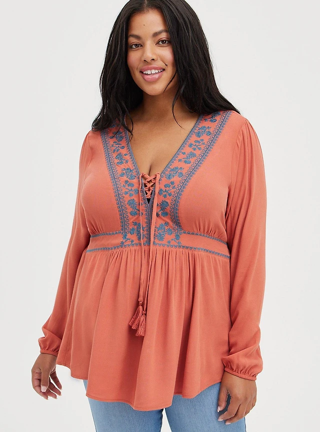 Babydoll Rayon Crepe Embroidered Lace-Up Top